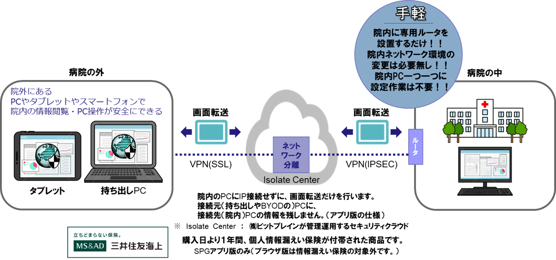 医療機関向けリモートサービス『SPG-Remote Medical』は、インターネットと切り離された高セキュリティ環境にある電子カルテや検査情報、画像情報、薬歴情報などの医療情報に、臨時施設など院外から工事不要で安全かつ簡単に利用できる仕組みを提供します。