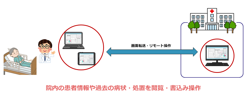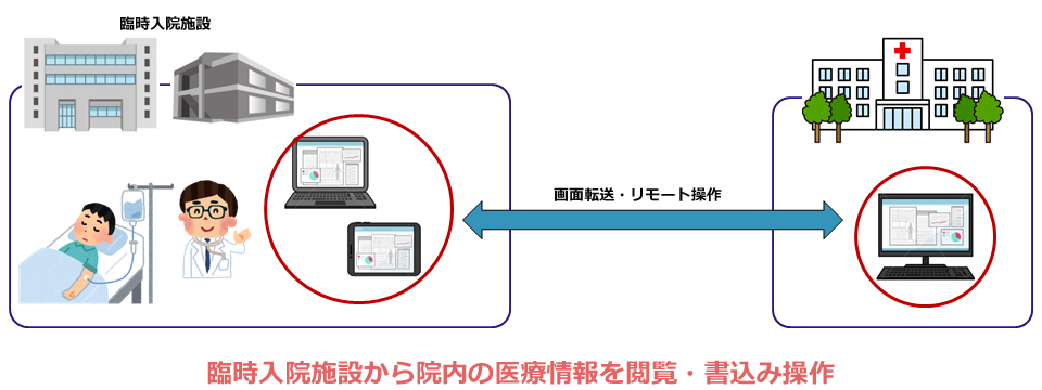 敷地内の空き棟や敷地外の公共施設などを利用して臨時の入院施設を開設するとき、臨時入院施設内で院内の電子カルテや画像データ、検査データなどの医療情報の閲覧・書込み操作が可能になります。