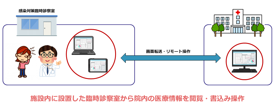 院外の臨時診察室でコロナ感染者か否かを診察・検査する場合に、臨時診察室で電子カルテや画像データ、検査データなどの医療情報の閲覧・書込み操作が可能になります。