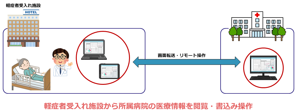 ホテルや旅館を軽症者受入れ施設として開設するとき、軽症者受入れ施設内で院内の電子カルテや画像データ、検査データなどの医療情報の閲覧・書込み操作が可能になります。